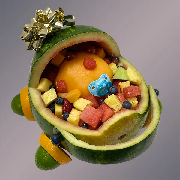 Includes Hand Carved Watermelon Carriage, cubed watermelon, cantaloupes, honeydew melon, pineapple, cut strawberries, blueberries and grapes.