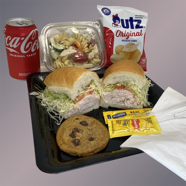 Includes: sandwich, salad, dessert (fruit or cookie), beverage (Water or Soda), condiments and utensils