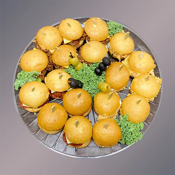 An assortment of sliders. An assortment of sliders. 8 Sliders pulled BBQ pork with Cheddar jack cheese, 8 Buffalo chicken with ranch dressing and 8 shredded beef with red onion slices and horseradish sauce